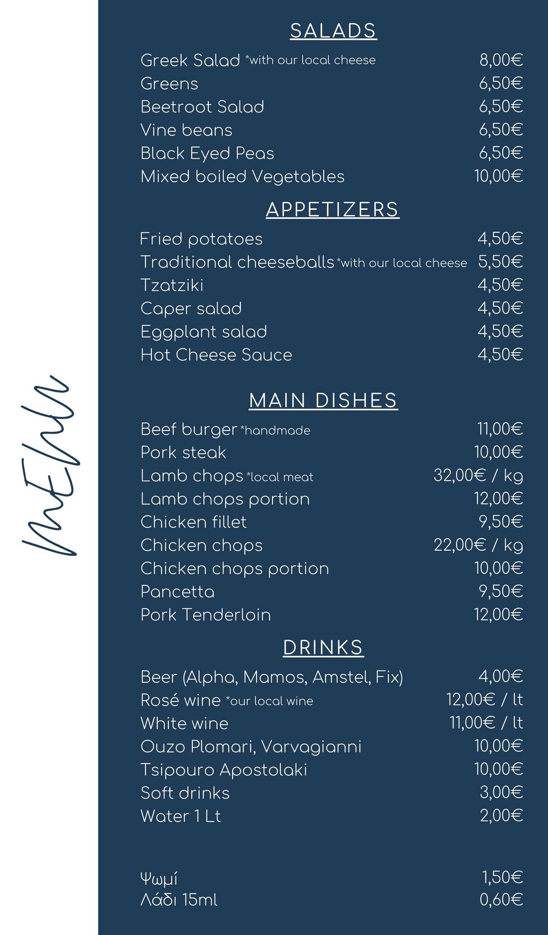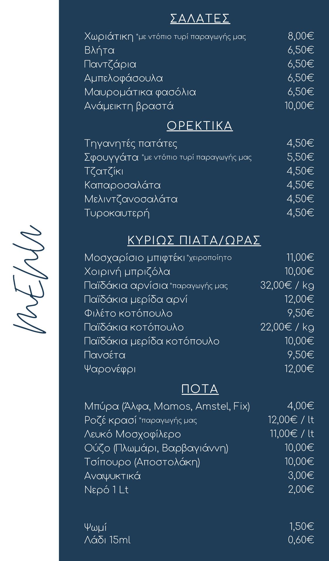 Στον επίγειο παράδεισο μας, στα 100 μέτρα από τη θάλασσα, ετοιμάζουμε καθημερινά επιλογές μαγειρευτών φαγητών, όπως: Κατσικάκι κοκκινιστό και λεμονάτο, παστίτσιο και μπριάμ, δίνοντας έμφαση στην ποιότητα των κρεάτων, αλλά και το σωστό ψήσιμο τους.